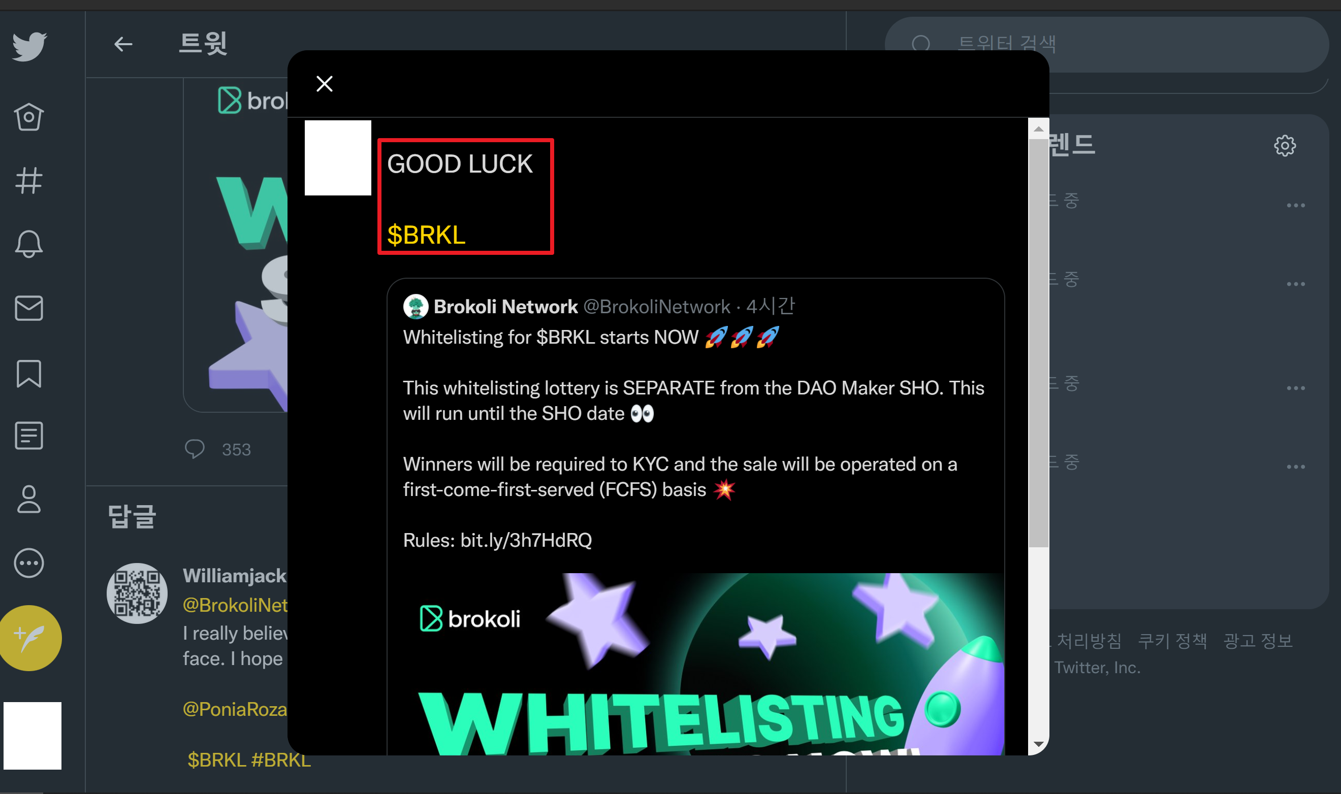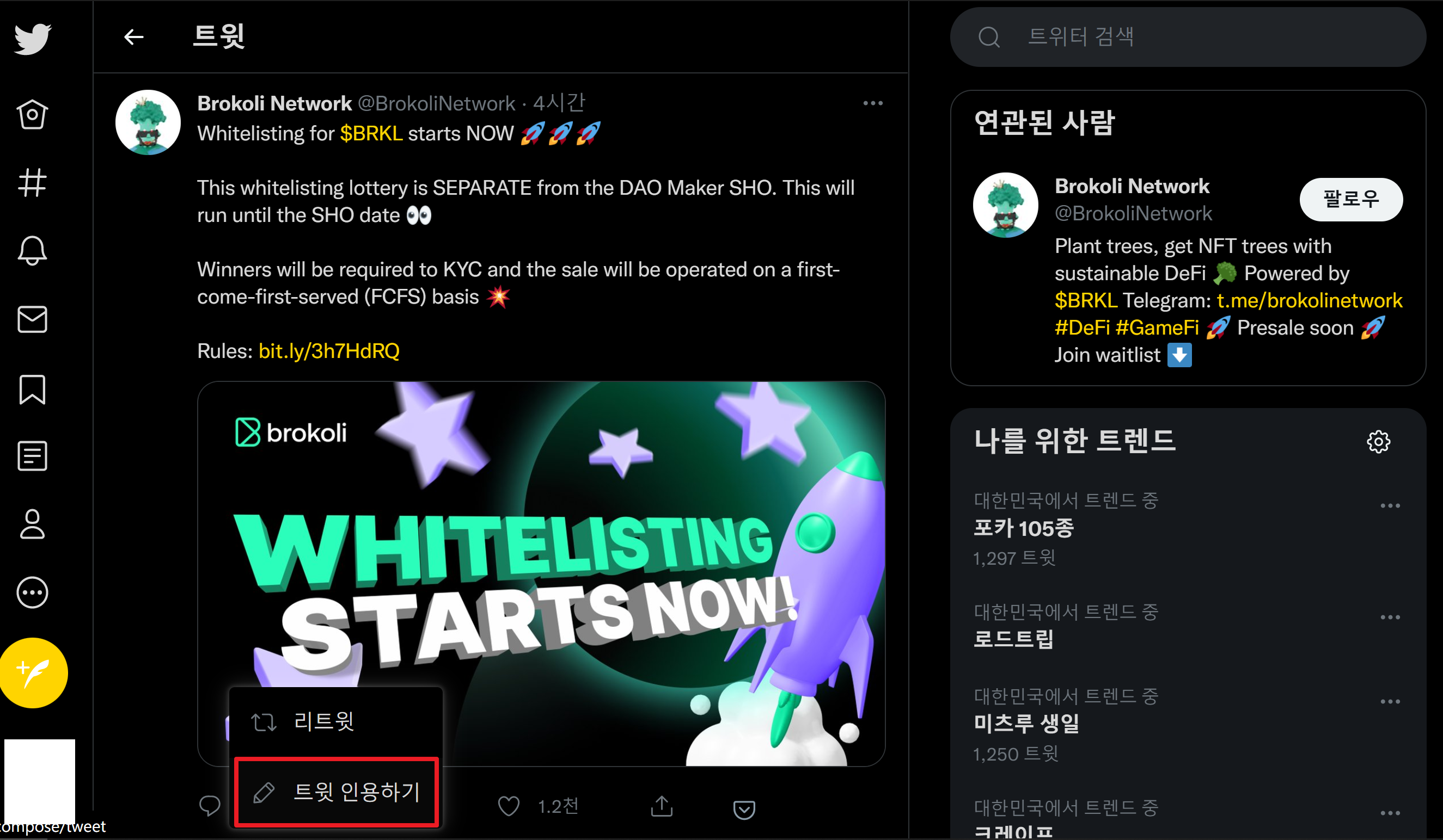 1. 브로콜리 네트워크의 트윗을 팔로우한다. : 링크를 누르시고 트윗으로 갑니다.