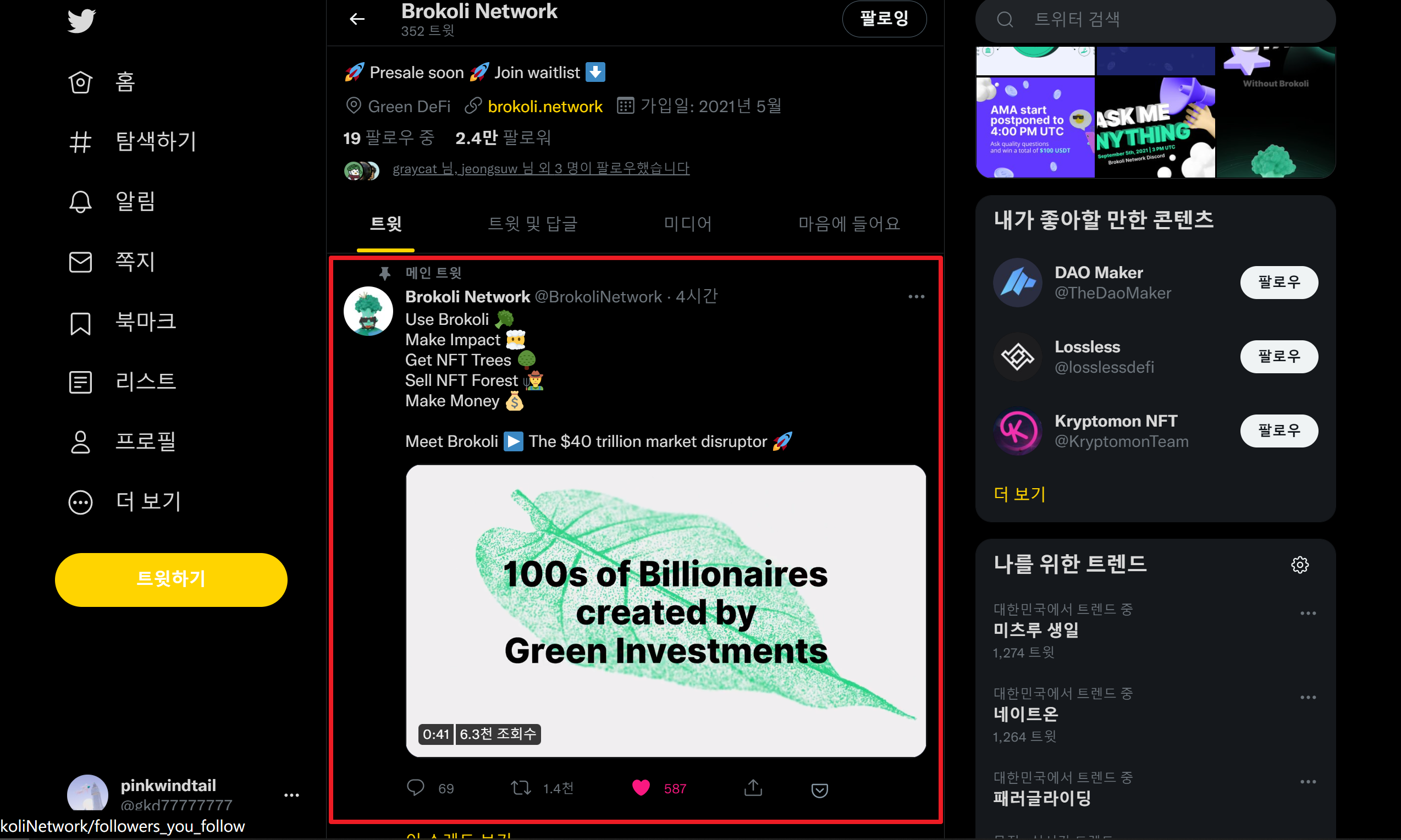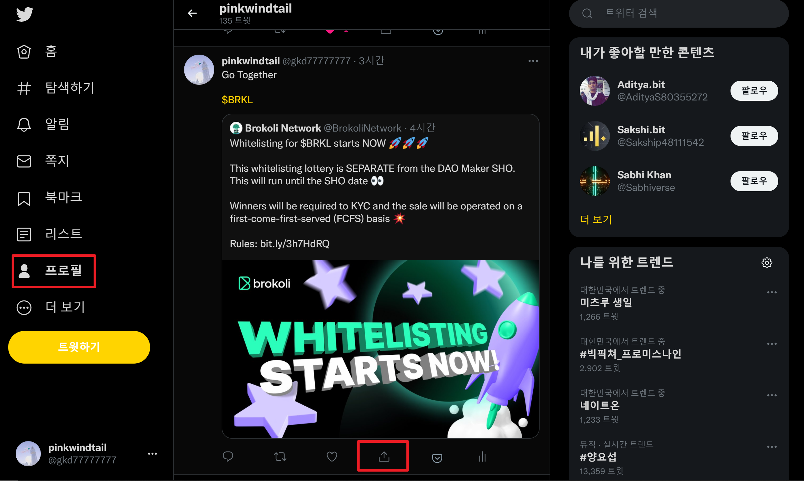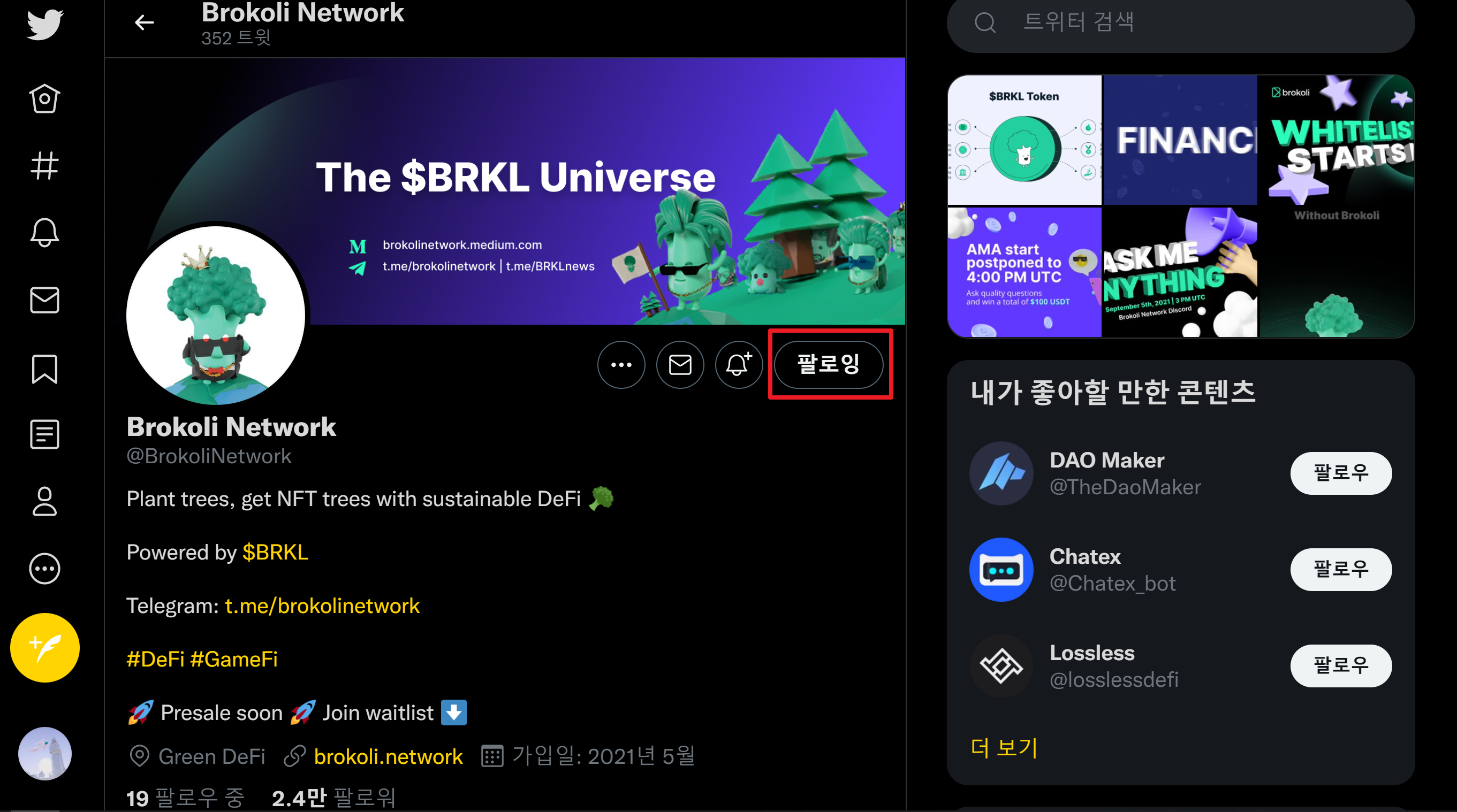 처음 팔로우하셨던 주소를 눌러주세요. (https://twitter.com/BrokoliNetwork)