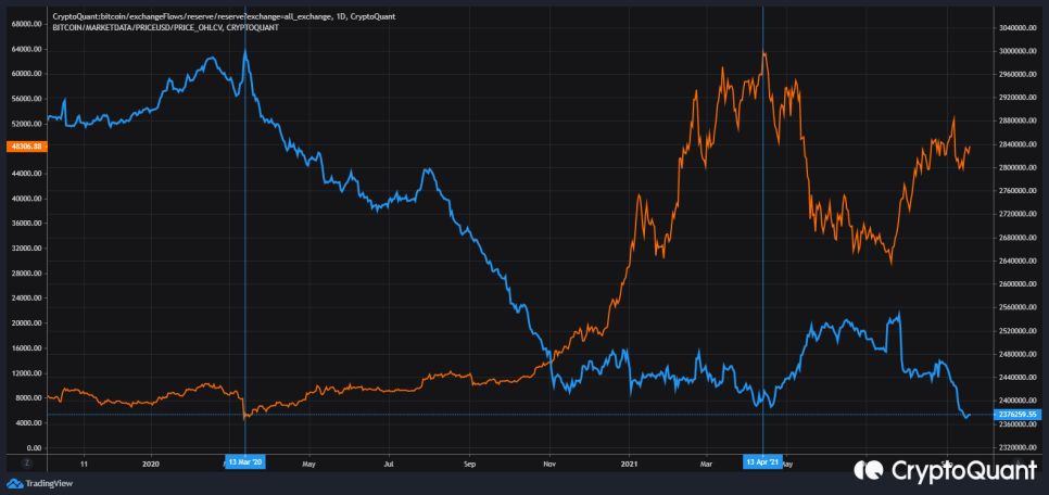 제가 위 사진에 그려진 왼쪽의 파란선을 보시면 거래소내 유지물량이 2020년 11월 13일 최고치를 찍고 2021년 4월 13일 오른쪽 파란선 까지 떨어지는 동안 비트코인의 가격은 지속적으로 상승을 보여주었고, 그 이후 거래소내 유지물량이 증가하는 동안 비트코인은 조정을 맛보았습니다.