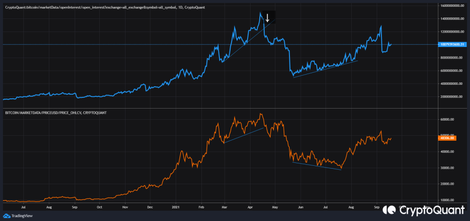 미체결 약정 (파랑색), 일봉상 비트코인 가격 (주황색)