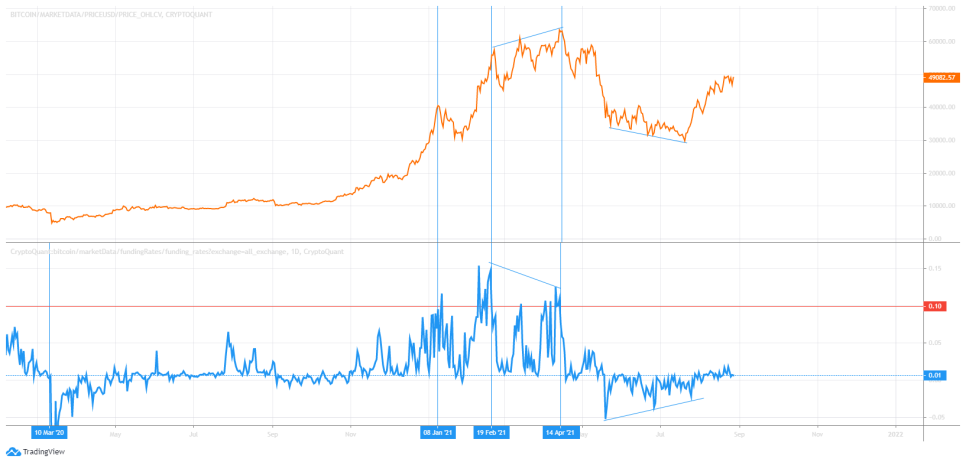 일봉상 비트코인 가격 (위), 모든 거래소의 펀딩비 평균(아래)