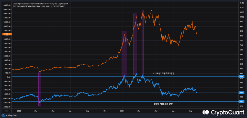 MVRV (파랑색), 일봉상 비트코인 가격 (주황색)
