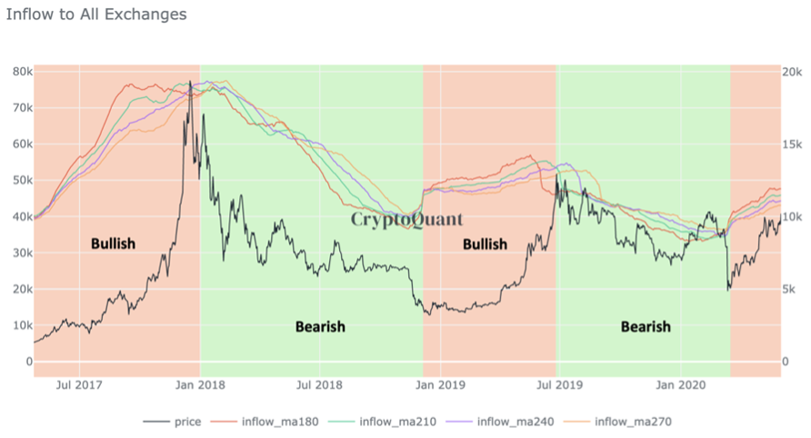 유입 및 유출 추세는 의미있는 수의 거래소가 활성화 된 지난 3 년 동안의 강세 또는 약세 감정을 대략 잘 설명하여 "거래소 활동"해석을 지원