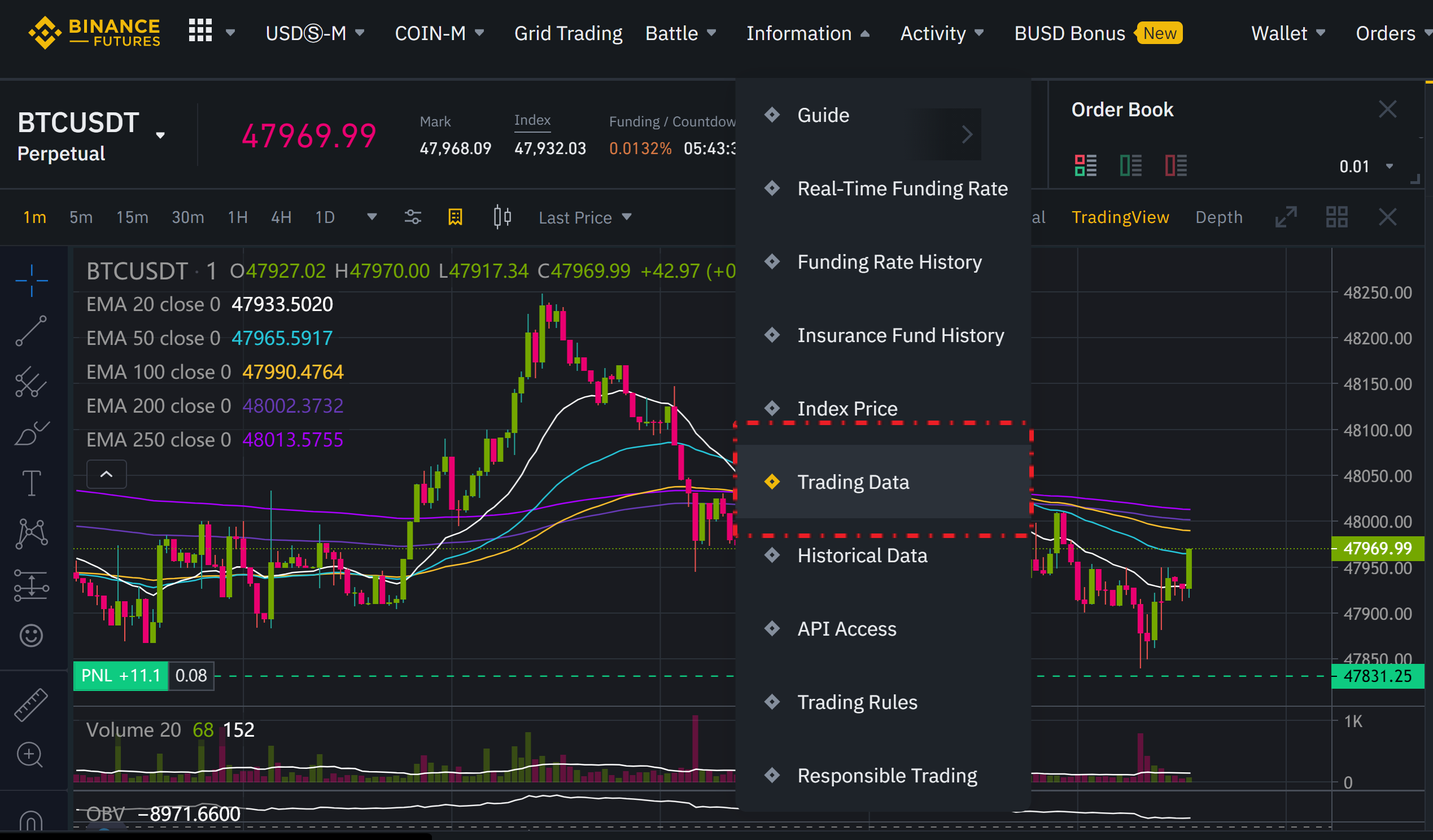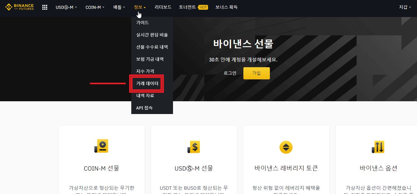 1. 미체결/미결제 약정은 선물에서 나타내는 수치이므로 바이낸스의 선물로 이동을 합니다.