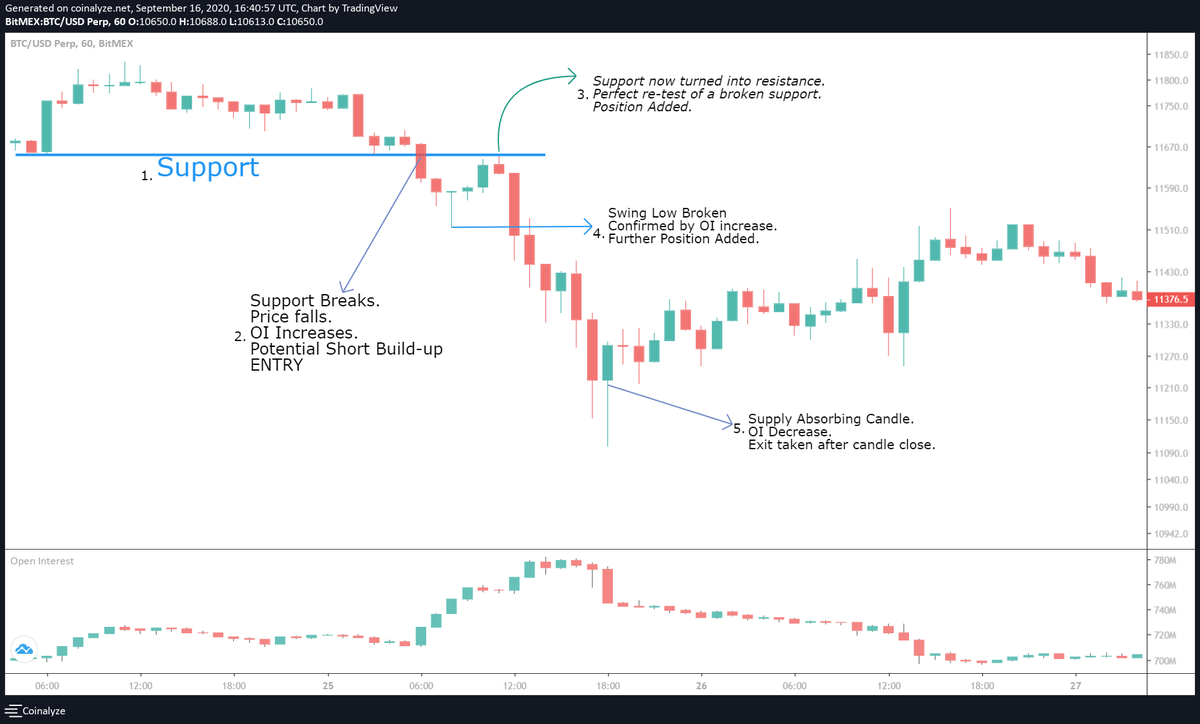 2. 지지 붕괴, 가격 하락 - OI 상승(숏 빌드업 예상), 숏 포지션 진입